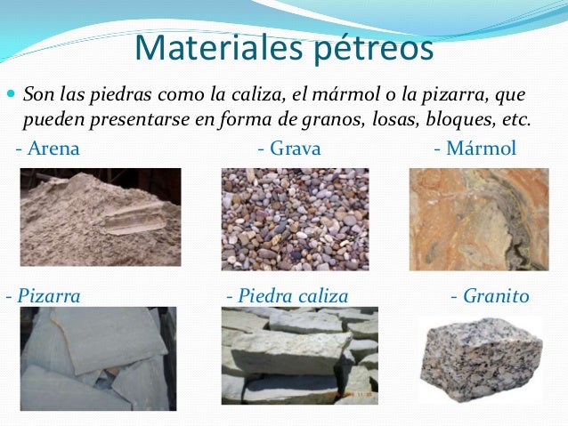 son aquellos que provienen de la roca, de una piedra o de un peñasco; habitualmente se encuentran en forma de bloques, losetas o fragmentos de distintos tamaños, principalmente en la naturaleza, aunque de igual modo existen otros que son procesados e industrializados por el ser humano.